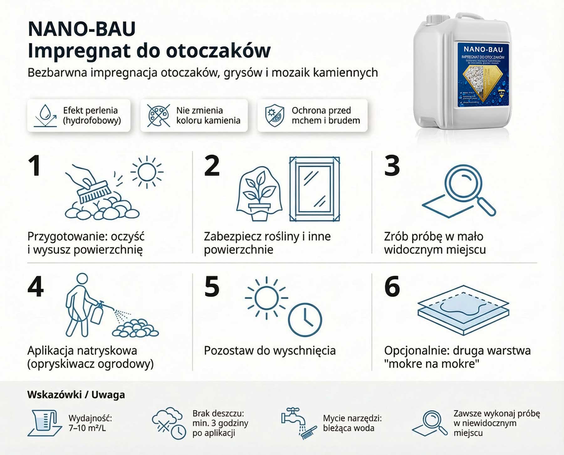 Udržte svoje dekoračné kamene čisté a odolné vďaka Impregnácia NANO-BAU pre kamienky a štrk – bezfarebná ochrana, ktorá uľahčuje následné na umývanie a čistenie udržiavanie povrchu. Príprava poskytuje hydrofóbnosť (guľôčkový efekt), obmedzuje prenikanie vody a nečistôt a pomáha chrániť kamienky a štrk pred každodenným znečistením. Je to ideálne riešenie pre oblasti v blízkosti terasa, príjazdová cesta, podľa dlažobné kocky / dlažobné kocky a na miestach vystavených vlhkosti a usadeninám. Vyberte výťažok 7–10 m² z 1 litra a dokonca aj ochranu do 5 rokov (v závislosti od podmienok a pôdy). Zamerajte sa na estetiku vašej záhrady a poriadok okolo vášho domu – s viditeľnými výsledkami už od prvej impregnácie.